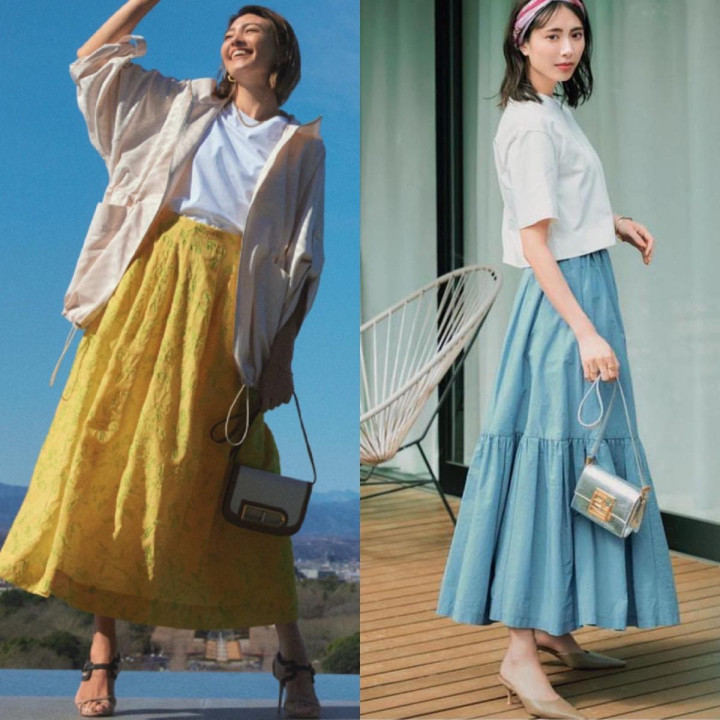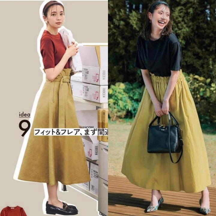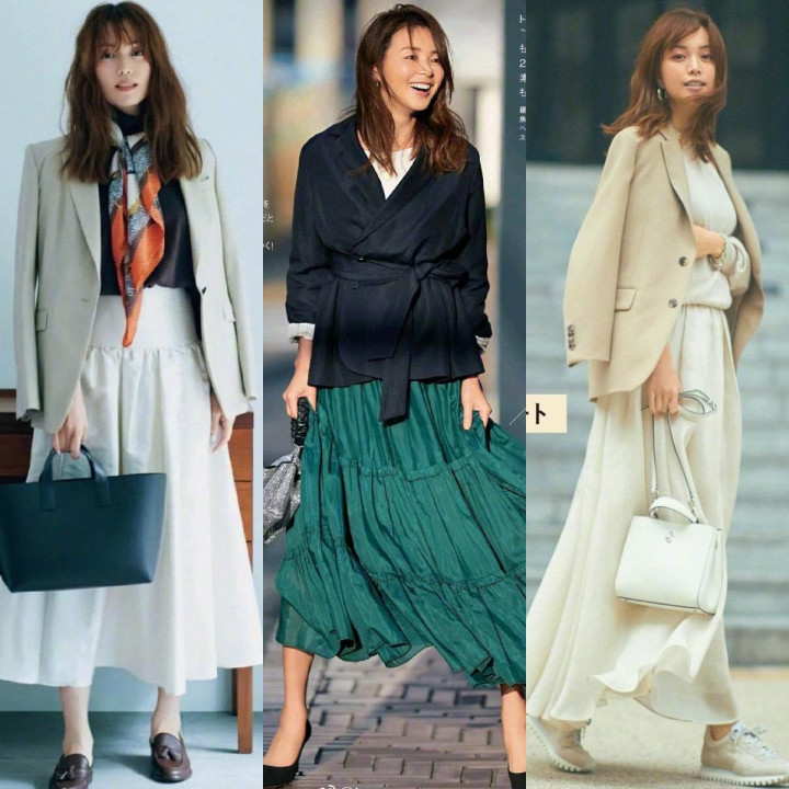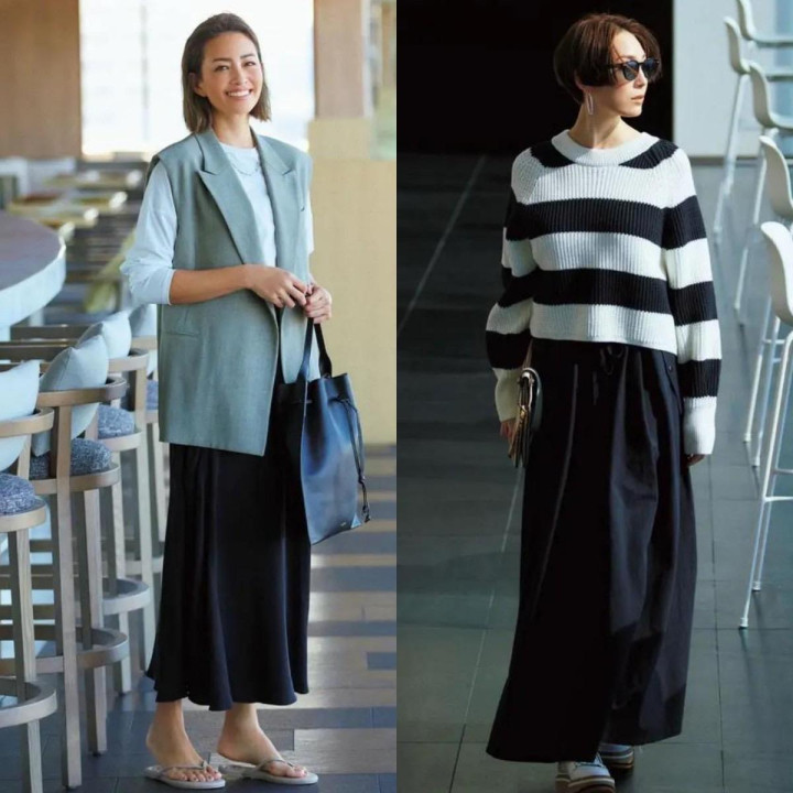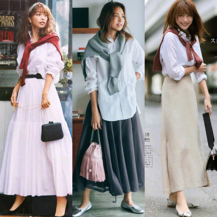 穿长裙也是很有讲究的,之所以日本主妇能够美到美的出彩,就是因为她们很会搭!尤其是在搭配阔版设计的半身裙时,日本主妇从不会穿笨重的厚底鞋,而是更爱浅口薄底鞋,舒适又轻便。