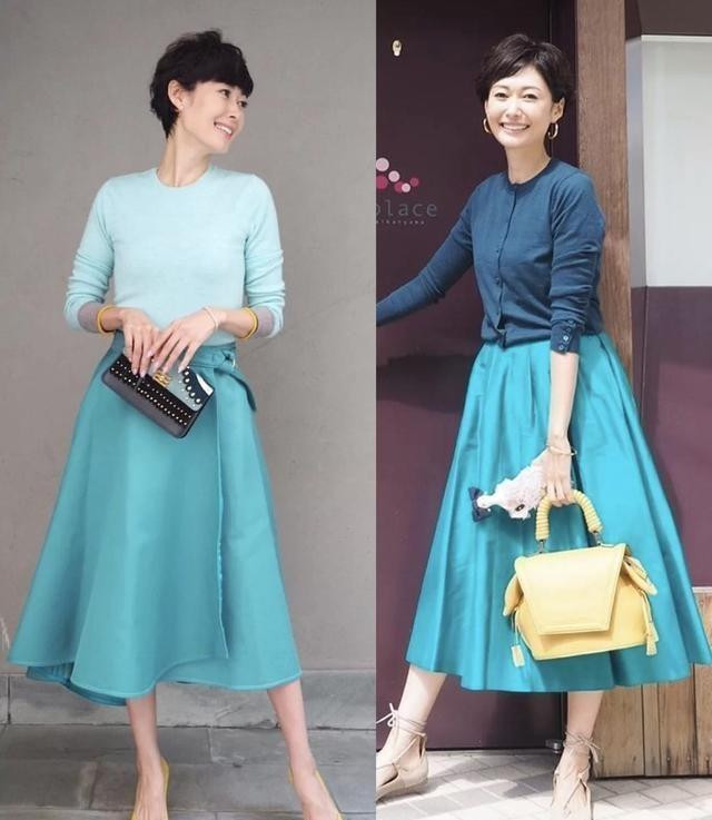 色彩简约的确高级,但是你要用对正确的配色技巧,想要让造型更加和谐,可以尝试一下同色系搭配,尤其是孔雀绿伞裙,搭配水绿色或者墨绿色的针织上衣,温柔又抬气质。